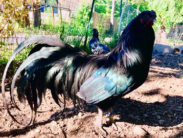 Black Sumatras are a rare, long-tailed ornamental breed from Indonesia. They are capable fliers and free rangers and are relatively cold-hardy with their small pea combs.
